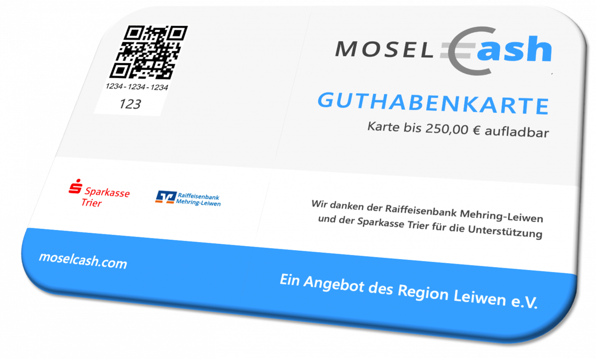 Herausgeber der MoselCash Card ist der Verein Region Leiwen e.V. regionleiwen.com. Bei Fragen zum Projekt stehen wir Ihnen jederzeit gerne zur Verfügung.